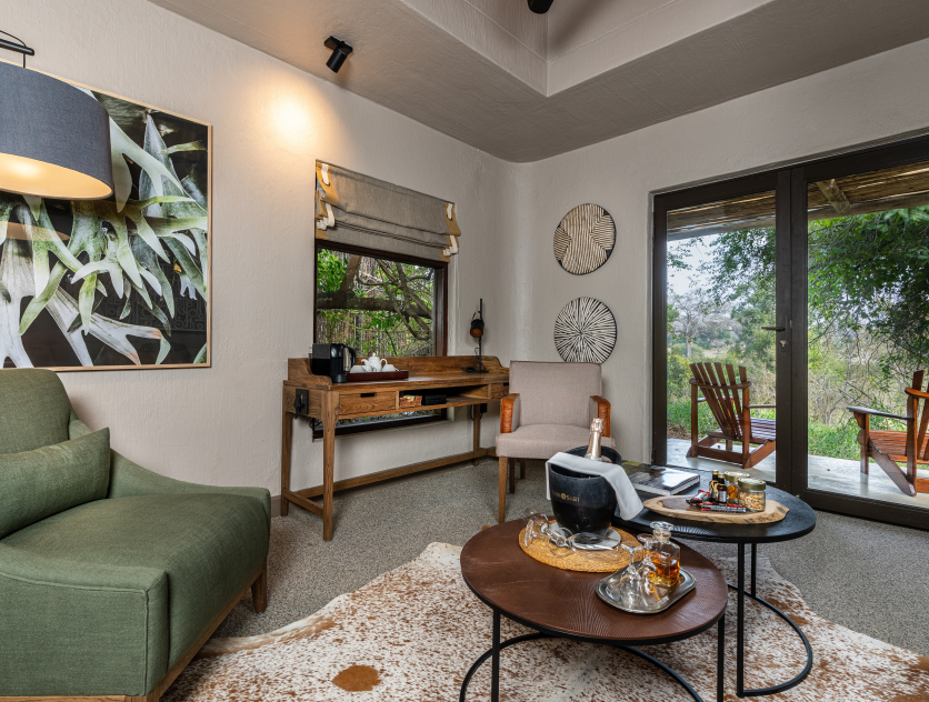 Each standalone suite is designed with privacy in mind and is generously proportioned with an open plan flow, day beds that convert into two child-friendly single beds, an inviting en-suite bathroom and sweeping views over the bushveld beyond.