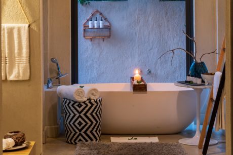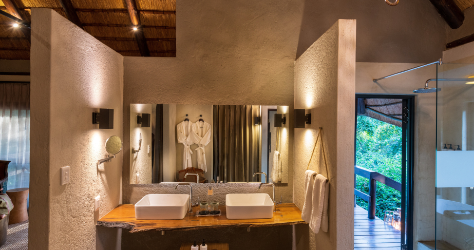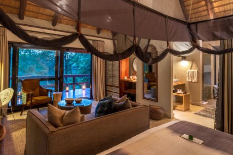 Each Luxury Suite comprises a generously sized open plan master bedroom and lounge, an en-suite bathroom and a sundeck with your own private spa bath. The oversized suite windows frame picturesque views of the bush and river below, creating the illusion of being alone in the vast African bush.